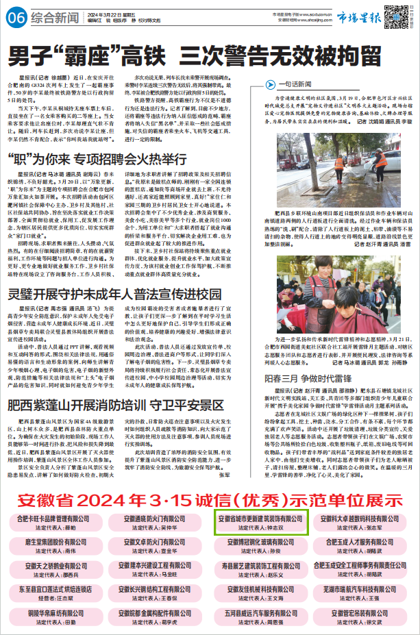 在誠信為本的商業(yè)大潮中,安徽省城市更新建筑裝飾有限公司憑借出色的業(yè)務表現(xiàn)和社會責任感,于2024年3月22日榮登市場星報綜合新聞電子刊,光榮獲得“安徽省2024年3·15誠信(優(yōu)秀)示范單位”的殊榮。