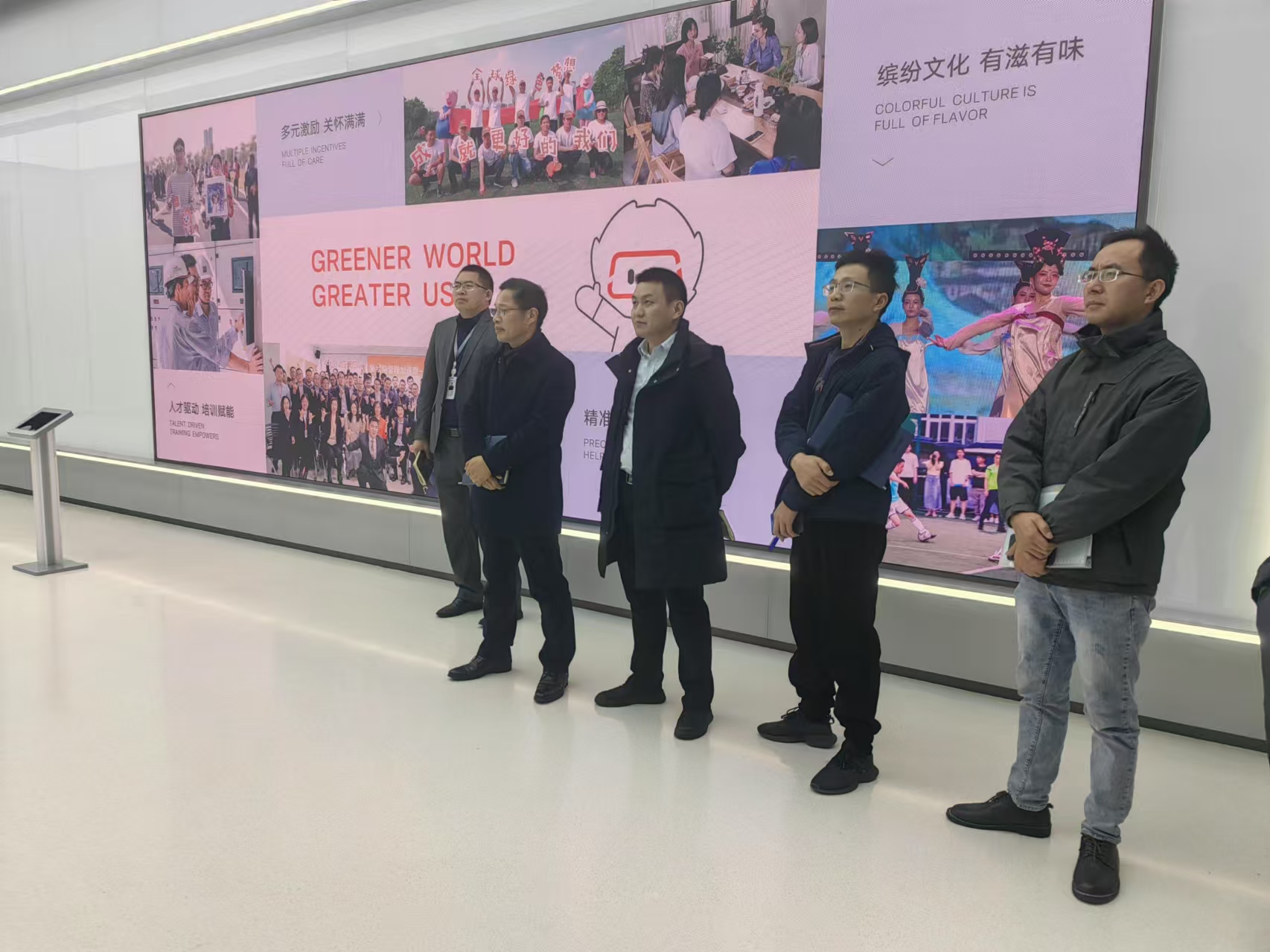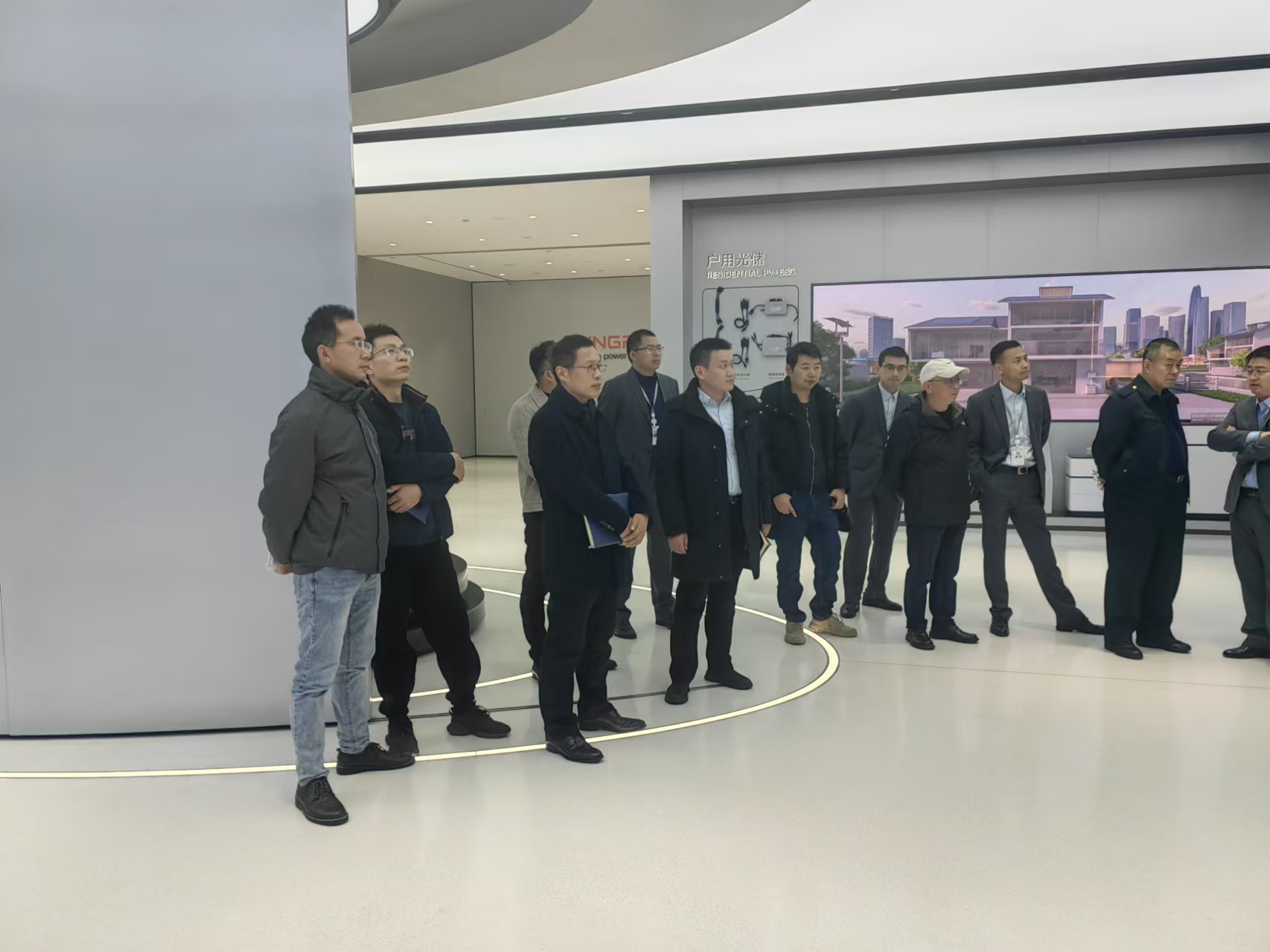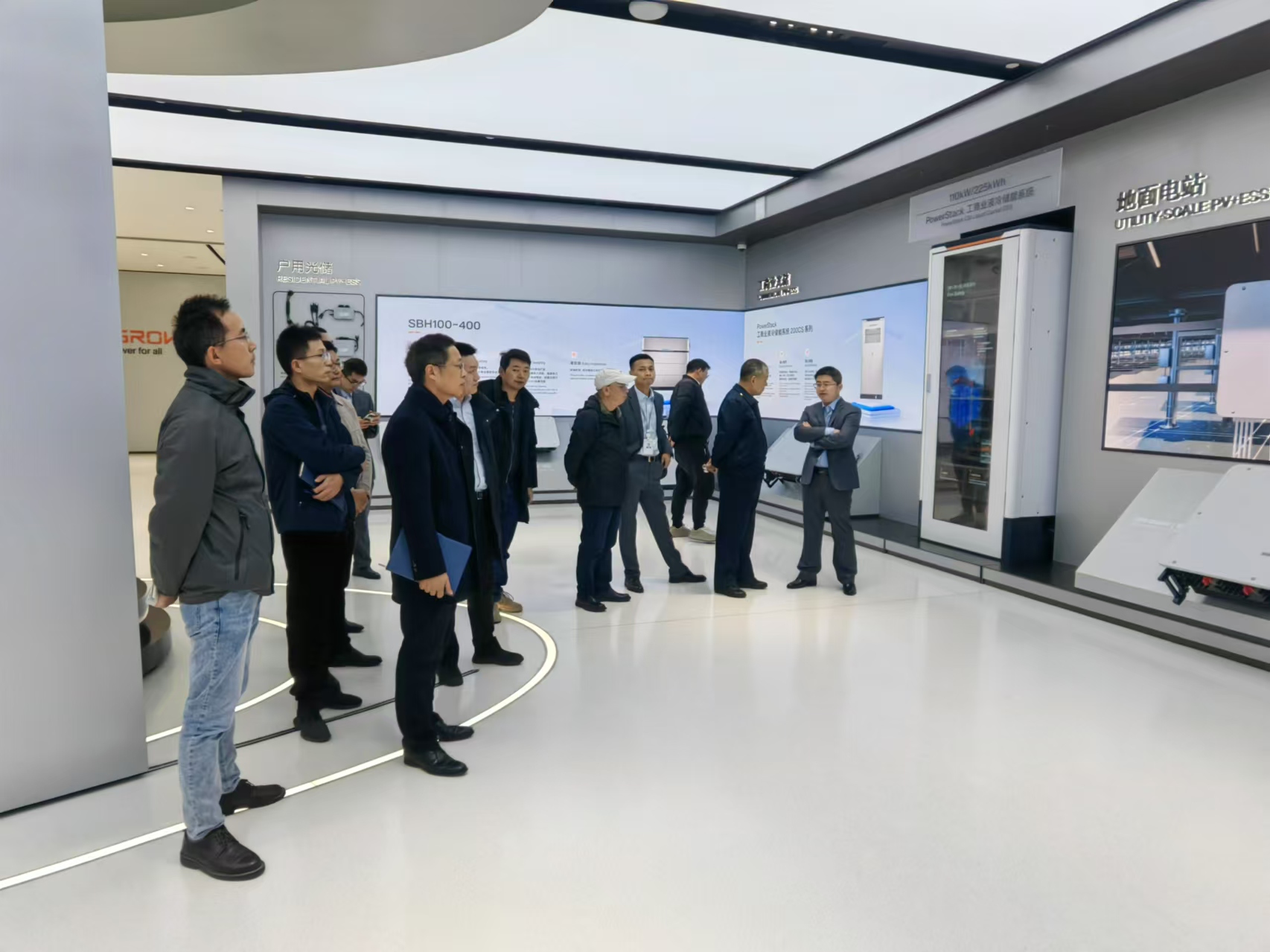 我司訪問團(tuán)隊在陽光電源新能源華中大區(qū)總監(jiān)潘龍華,安徽充電業(yè)務(wù)負(fù)責(zé)人王晨利及技術(shù)高級工程師王軍的引領(lǐng)下,參觀了光儲電制造車間和新能源技術(shù)展廳,踏入陽光電源集團(tuán)展廳后,我們一行人聚精會神地聆聽了講解員的精彩講解。