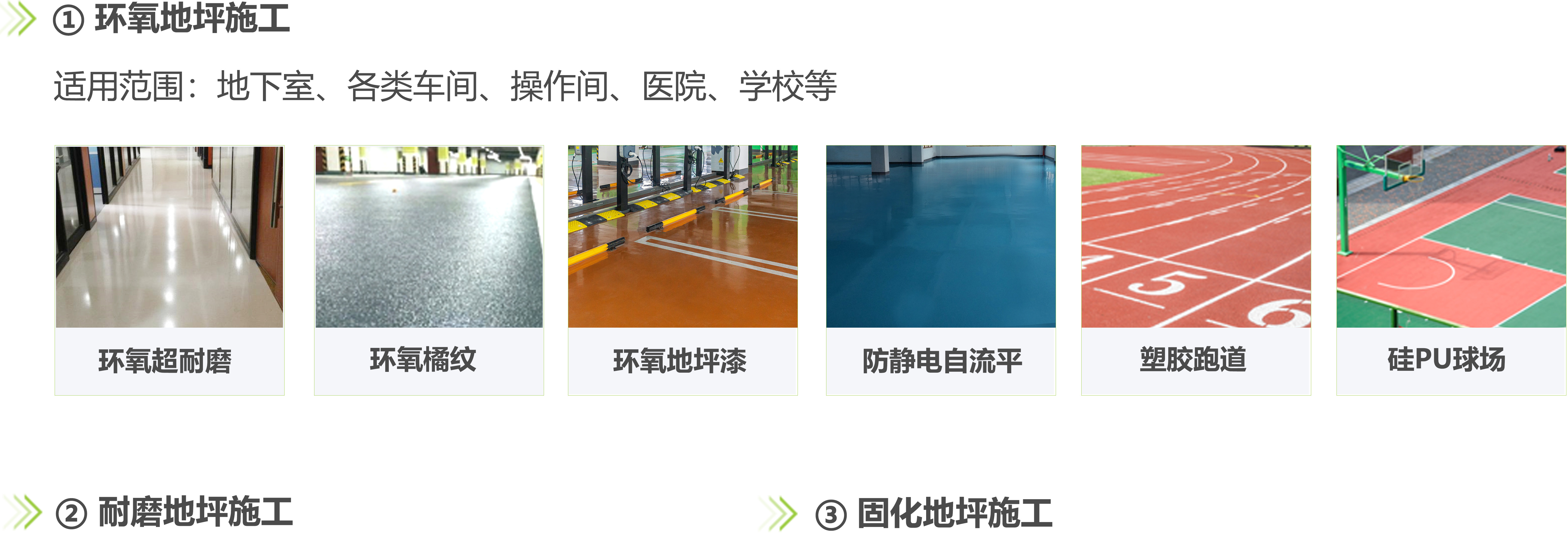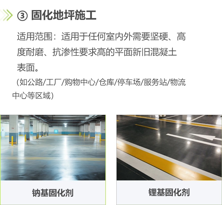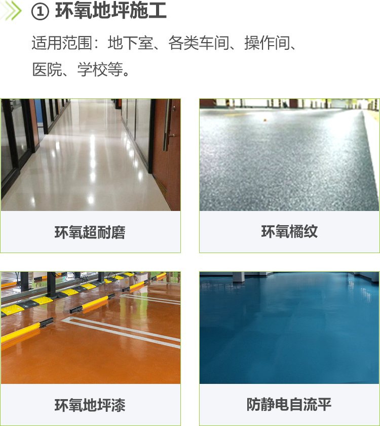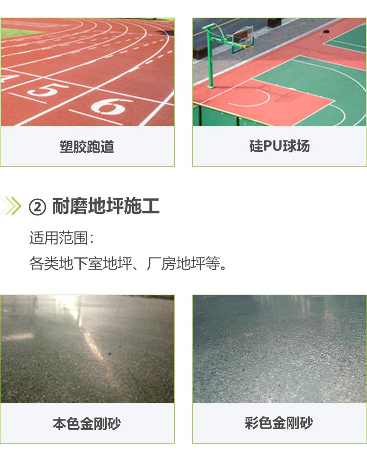 主要有滲透固化地坪及各類環(huán)氧地坪改造。(包含精鋼砂地坪、耐磨環(huán)氧地坪、環(huán)氧樹脂地坪系列、聚氨酯地坪系列、水泥自流平系列、丙烯酸地坪系列、運動場地坪、彩砂地坪、水泥固化地坪、硅PU球場、塑膠跑道等。)